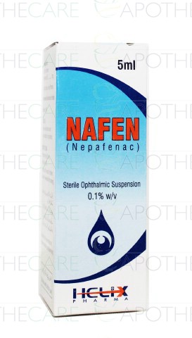 Product Name: Nafen Ophthalmic Susp 0.001% 5mlProduct Form: SuspensionPack Size: 5mlMarketed By: Helix PharmaGeneric Category: NSAIDIngredients: Nepafenac