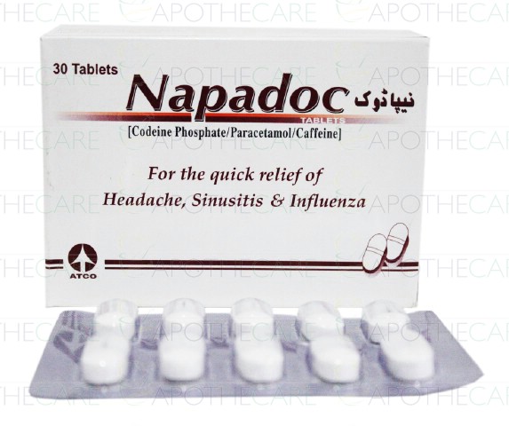 Product Name: NAPADOC Tab 3x10'sProduct Form: TabletsPack Size: 3x10'sMarketed By: ATCO LABORATORIES (PVT) LTDGeneric Category: Narcotic Analgesic Ingredients: Codeine phosphate 15mg ,Paracetamol 500mg ,Caffeine 30mg