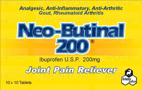 Product Name: Neo-Butinal 200 Tab 200mg 10x10'sProduct Form: TabletsPack Size: 10x10'sMarketed By: SCHAZOO ZAKA (PVT) LTDGeneric Category: NSAIDIngredients: Ibuprofen