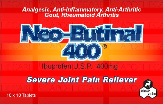 Product Name: Neobutinal Tab 400mg 10x10'sProduct Form: TabletsPack Size: 10x10'sMarketed By: SCHAZOO ZAKA (PVT) LTDGeneric Category: NSAIDIngredients: Ibuprofen