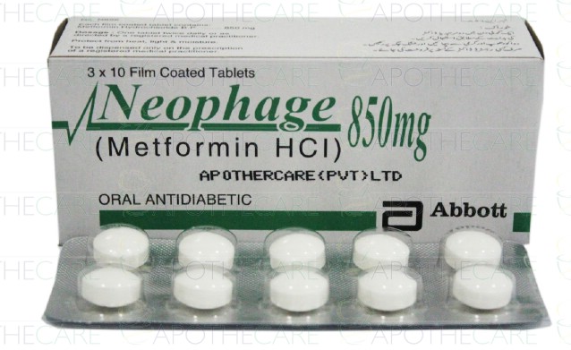 Product Name: Neophage Tab 850mg 3x10'sProduct Form: TabletsPack Size: 3x10'sMarketed By: ABBOTT LABORATORIES (PAKISTAN) LTD.Generic Category: Oral HypoglycemicIngredients: Metformin
