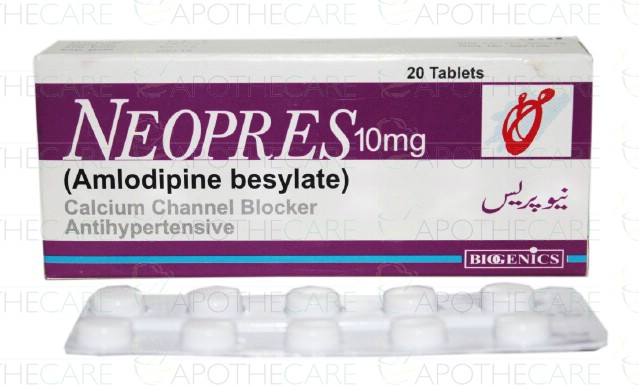 Product Name: Neopres Tab 10mg 2x10's Product Form: TabletPack Size: 2x10'sMarketed By: Biogenics PharmaGeneric Category: ANTI-HYPERTENSIVEIngredients: Amlodipine Besylate