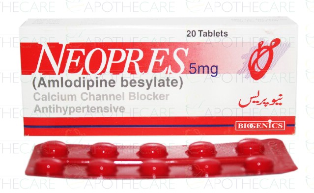 Product Name: Neopres Tab 5mg 2x10'sProduct Form: TabletPack Size: 2x10'sMarketed By: Biogenics PharmaGeneric Category: Anti-HypertensiveIngredients: Amlodipine Besylate
