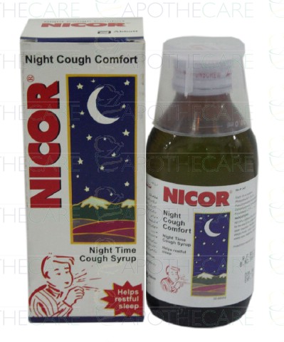 Product Name: NICOR Syp 120mlProduct Form: SyrupPack Size: 120mlMarketed By: ABBOTT LABORATORIES (PAKISTAN) LTD.Generic Category: COUGH SUPPRESSANT Ingredients: Each 5ml contains Pholcodine 1.665mgl, Paracetamol:100mg , Diphenhydramine 1.665mg, Pseudoephedrine (HCl) 6.665mg
