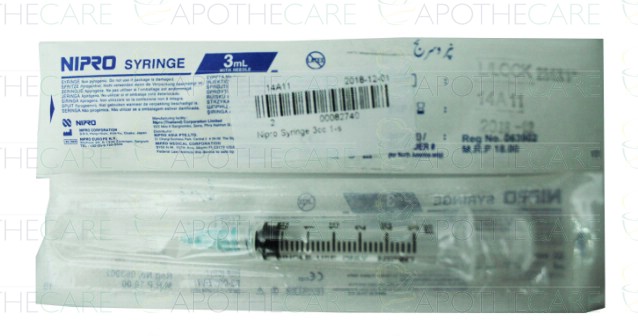 Product Name: Nipro Syringe 3cc 1'sProduct Form: SyringePack Size: 1'sMarketed By: Nipro CorporationGeneric Category: Surgical products