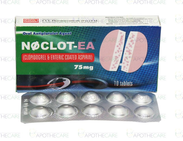 Product Name: Noclot-EA Tab 75mg/75mg 10'sProduct Form: TabletsPack Size: 10'sMarketed By: CCL PharmaceuticalsGeneric Category: Anti-Platelet AggregationIngredients: Clopidogrel 75mg, Aspirin 75mg