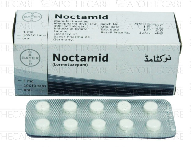 Product Name: Noctamid Tab 1mg 10x10'sProduct Form: TabletsPack Size: 10x10'sMarketed By: Bayer Health Care Pakistan (Pvt) LtdGeneric Category: BenzodiazepineIngredients: Lormetazepam