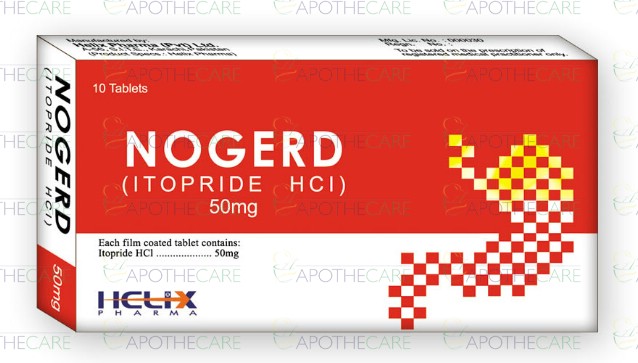 Product Name: Nogerd Tab 50mg 10'sProduct Form: TabletsPack Size: 10'sMarketed By: Helix Pharma (Pvt) LtdGeneric Category: GastroprokineticsIngredients: Itopride HCl