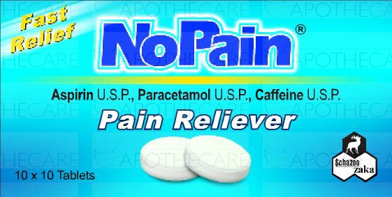 Product Name: Nopain Tab 10x10'sProduct Form: TabletsPack Size: 10x10'sMarketed By: SCHAZOO ZAKA (PVT) LTDGeneric Category: FEVER AND PAIN RELIEFIngredients: Aspirin 300mg, Paracetamol 200mg, Caffeine 30mg