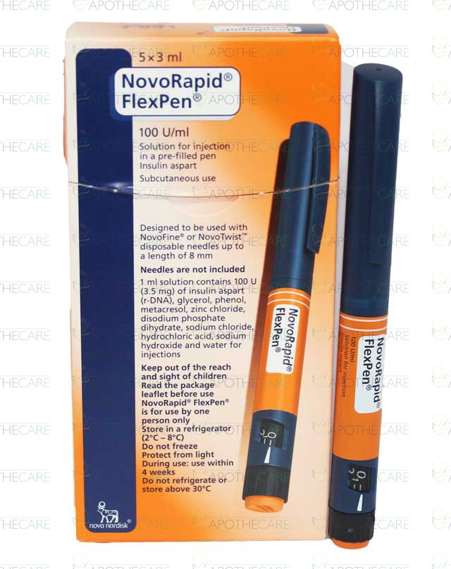 Product Name: NovoRapid FlexPen Inj 100IU 5PFPx3mlProduct Form: InjectionPack Size: 5PFPx3mlMarketed By: NOVO NORDISK PHARMA PVT LTDGeneric Category: Fast-acting InsulinsIngredients: Insulin Aspart Storage Condition: Store at 2 - 80C (Do not freeze)