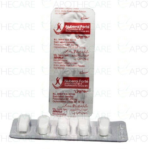 Product Name: Nuberol Forte Tab 650mg/50mg 5'sProduct Form: TabletsPack Size: 5'sMarketed By: SEARLE PAKISTAN Generic Category: Muscle RelaxantsIngredients: Paracetamol 650mg, Orphenadrine Citrate 50mg