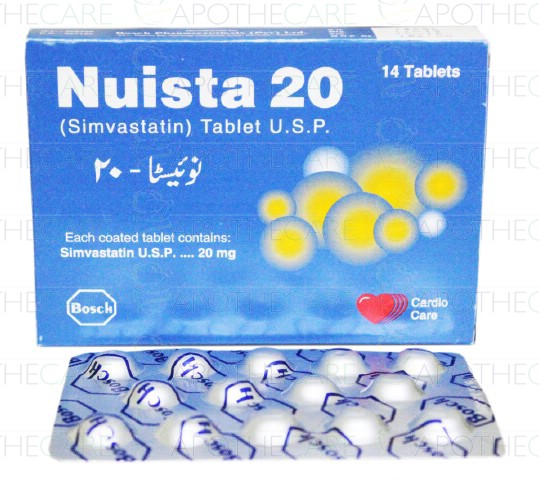 Product Name: NUISTA Tab 20mg 14'sProduct Form: TabletPack Size: 14'sMarketed By: BOSCH PHARMACEUTICALS (PVT) LTDGeneric Category: STATINSIngredients: Simvastatin