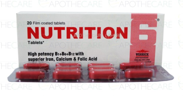 Product Name: Nutrition-6 Tab 2x10'sProduct Form: TabletsPack Size: 2x10'sMarketed By: Werrick PharmaceuticalsGeneric Category: Iron and Vitamin SupplementIngredients: Ferrous Gluconate 250mg, Vitamin B1 100mg, Vitamin B6 100mg, Vitamin B12 250mcg, Calcium Glycerophosphate 66.50mg and Folic Acid 1mg