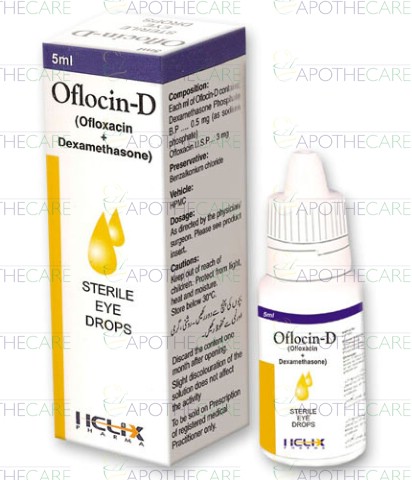 Product Name: Oflocin-D Eye Drops 5mlProduct Form: DropsPack Size: 5mlMarketed By: Helix Pharma (Pvt) LtdGeneric Category: Anti-Inflammatory + Anti-InfectiveIngredients: Dexamethasone 0.5mg ,Ofloxacin 3mg