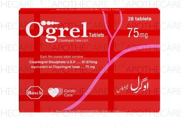 Product Name: OGREL Tab 75mg 2X14'sProduct Form: TabletPack Size: 2x14'sMarketed By: BOSCH PHARMACEUTICALS (PVT) LTDGeneric Category: Anti-Platelet AggregationIngredients: Clopidogrel
