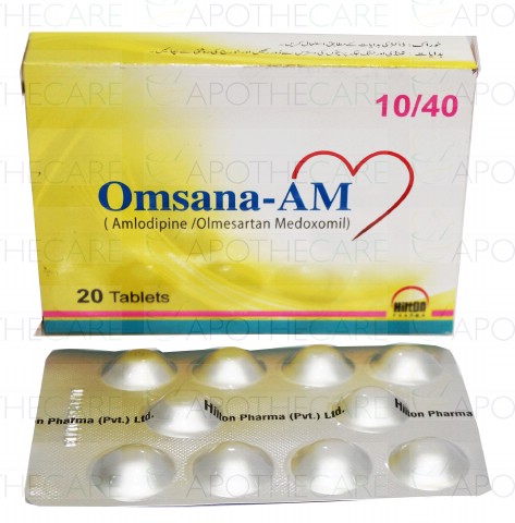Product Name: Omsana-AM 10mg/40mg Tab 20'sProduct Form: TabletPack Size: 20'sMarketed By: Hilton PharmaGeneric Category: Anti-HypertensiveIngredients: Olmisartan