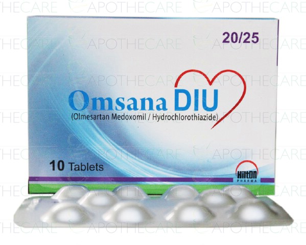 Product Name: Omsana-DIU Tab 20mg/25mg 10'sProduct Form: TabletsPack Size: 10'sMarketed By: Hilton Pharma (Pvt) Ltd.Generic Category: Anti-HypertensiveIngredients: Olmesartan 20mg,Hydrochlorthiazide 25mg