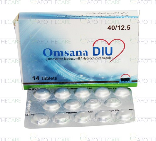 Product Name: Omsana-DIU Tab 40mg/12.5mg 14'sProduct Form: TabletsPack Size: 14'sMarketed By: Hilton Pharma (Pvt) Ltd.Generic Category: Anti-HypertensiveIngredients: Olmesartan 40mg,Hydrochlorthiazide 12.5mg