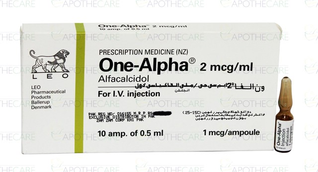 Product Name: One-Alpha Inj 2mcg 10Ampx0.5mlProduct Form: InjectionPack Size: 10Ampx0.5mlMarketed By: leo Pharmaceuticals Products - DenmarkGeneric Category: VITAMIN-D ANALOGUE Ingredients: Alfacalcidol