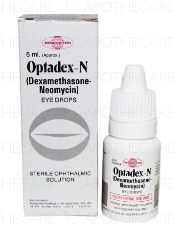 Product Name: Optadex-N Eye Drops 5mlProduct Form: DropsPack Size: 5mlMarketed By: Remington PharmaceuticalsGeneric Category: Corticosteroids, Anti-bacterialIngredients: Neomycin 0.35%w/v, Dexamethasone 0.1%w/v