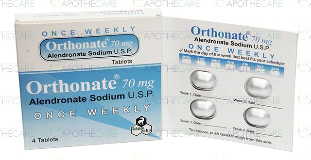 Product Name: ORTHONATE Tab 70mg 1x4'sProduct Form: TabletsPack Size: 1x4'sMarketed By: SCHAZOO ZAKA (PVT) LTDGeneric Category: BISPHOPHONATESIngredients: Alendronate sodium