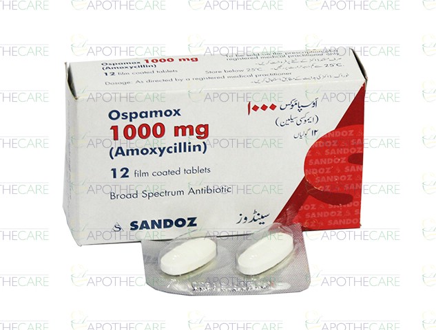 Product Name: Ospamox Tab 1000mg 12's Product Form: Tablets Pack Size: 12's Marketed By: NOVARTIS PHARMA PAKISTAN LTDGeneric Category: Amino-penicillinIngredients: Amoxicillin