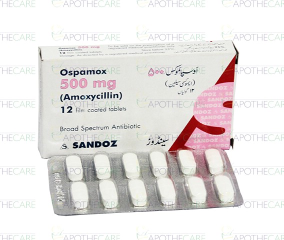 Product Name: Ospamox Tab 500 mg 12's Product Form: Tablets Pack Size: 12's Marketed By: NOVARTIS PHARMA PAKISTAN LTDGeneric Category: Amino-penicillinIngredients: Amoxicillin