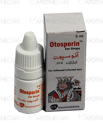 Product Name: Otosporin Ear Drops 5mlProduct Form: DropsPack Size: 5mlMarketed By: Glaxosmithkline Pakistan LimitedGeneric Category: Anti-Bacterial+CorticosteroidIngredients: Polymyxin B 10000IU/ml, Neomycin 3400IU/ml, Hydrocortisone 1%