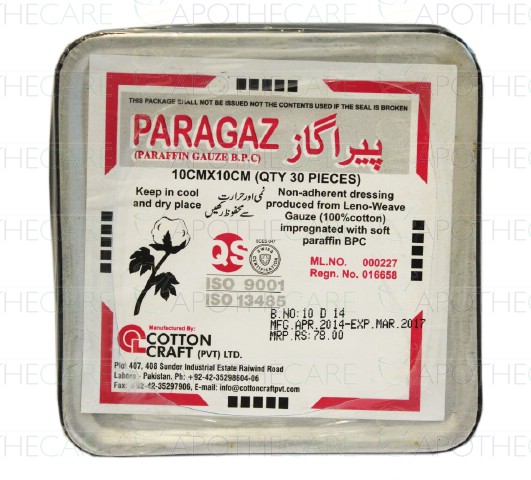 Product Name: Paragraz Paraffin Gauze 10cmx10cm 30'sProduct Form: Paragaz (Paraffin Gauze BP) TinPack Size: 10cm X 10cm (1 X 30)Marketed By: COTTON CRAFT (PVT) LTDGeneric Category: Surgical Products