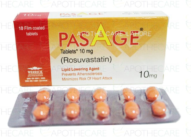 Product Name: Pasage Tab 10mg 10'sProduct Form: TabletsPack Size: 10'sMarketed By: Werrick PharmaceuticalsGeneric Category: StatinsIngredients: Rosuvastatin