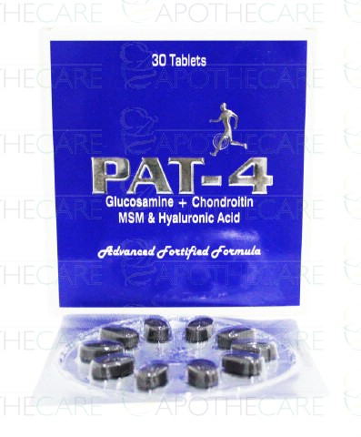 Product Name: Pat-4 Tab 3x10'sProduct Form: TabletsPack Size: 3x10'sMarketed By: Mass Pharma (Pvt) Ltd Generic Category: Disease Modifier For ArthritisIngredients: Glucosamine 500mg, Chondroitin 500mg ,Methyl Sulfonylmethane 400mg, Hyaluronic Acid 1.67mg