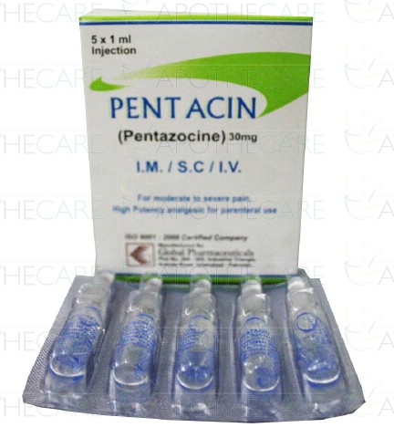 Product Name: Pentacin Inj 30mg 5Ampx1mlProduct Form: InjectionPack Size: 5Ampx1mlMarketed By: GLOBAL PHARMAGeneric Category: NARCOTIC ANALGESICIngredients: Pentazocine