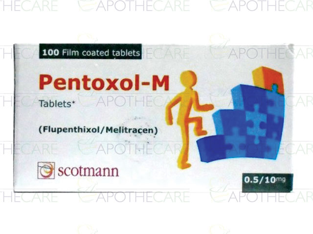 Product Name: Pentoxol-M Tab 0.5mg/10mg 100'sProduct Form: TabletsPack Size: 100'sMarketed By: Scotmann PharmaceuticalsGeneric Category: Anti-DepressantIngredients: Flupenthixol 0.5mg, Melitracen 10mg