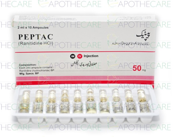 Product Name: Peptac Inj 50mg 10Ampx2mlProduct Form: InjectionPack Size: 10Ampx2mlMarketed By: MASS PHARMAGeneric Category: Anti-UlcerantIngredients: Ranitidine