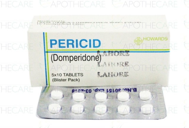 Product Name: Pericid Tab 10mg 5x10'sProduct Form: TabletsPack Size: 5x10'sMarketed By: Lahore Chemical & Pharmaceutical Works (Pvt) LtdGeneric Category: Gastroprokinetic Ingredients: Domperidone