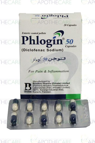 Product Name: Phlogin-50 Cap 50mg 2x10'sProduct Form: CapsulesPack Size: 2x10'sMarketed By: BROOKES PHARMACEUTICAL LABS (PAKISTAN) LTDGeneric Category: NSAIDIngredients: Diclofenac Sodium