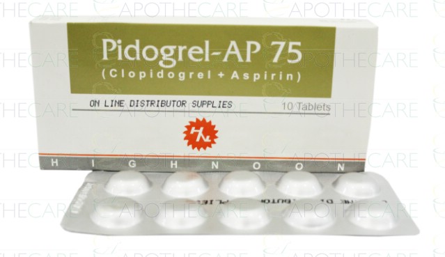Product Name: Pidogrel-AP Tab 75mg/75mg 10'sProduct Form: TabletsPack Size: 10'sMarketed By: HIGHNOON LABORATORIES LTD.Generic Category: Anti-Platelet AggregationIngredients: Clopidogrel Bisulphate 75mg, Aspirin 75mg