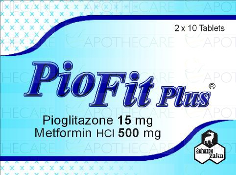 Product Name: Piofit Plus Tab 15mg/500mg 2x10'sProduct Form: TabletsPack Size: 2x10'sMarketed By: SCHAZOO ZAKA (PVT) LTDGeneric Category: ORAL HYPOGLYCEMIC Ingredients: Pioglitazone 15mg, Metformin HCL 500mg