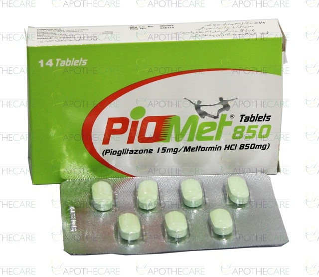 Product Name: Piomet Tab 15mg/850mg 14'sProduct Form: TabletsPack Size: 14'sMarketed By: CCL PharmaceuticalsGeneric Category: Oral HypoglycemicIngredients: Pioglitazone 15mg, Metformin 850mg