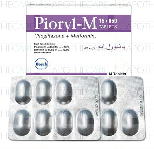 Product Name: Pioryl-M Tab 15mg/850mg 2x7'sProduct Form: TabletPack Size: 2x7'sMarketed By: BOSCH PHARMACEUTICALS (PVT) LTDGeneric Category: ORAL HYPOGLYCEMIC Ingredients: Pioglitazone 15mg, Metformin 850mg