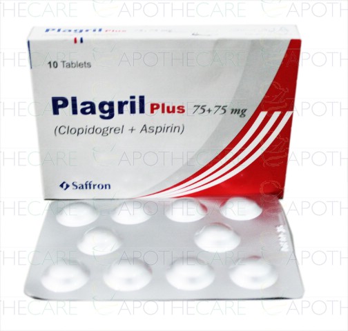 Product Name: Plagril Plus Tab 75mg/75mg 10'sProduct Form: TabletsPack Size: 10'sMarketed By: SAFFRON PHARMACEUTICALS COMPANYGeneric Category: Anti-Platelet AggregationIngredients: Clopidogrel 75mg, Aspirin 75mg