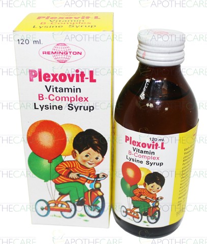 Product Name: Plexovit-L Syp 120mlProduct Form: Syrup Pack Size: 120mlMarketed By: Remington PharmaceuticalsGeneric Category: MultivitaminsIngredients: Each 5ml contains: Nicotinamide:18mg , Riboflavin 1.666mg , Thiamine HCl 4.16mg , Ascorbic Acid 75mg , Calcium Pantothenate 2.5mg , Cyanocobalamin 8.33mcg , Pyridoxine 1mg , Lysine 33.33mg ,Inositol 5mg
