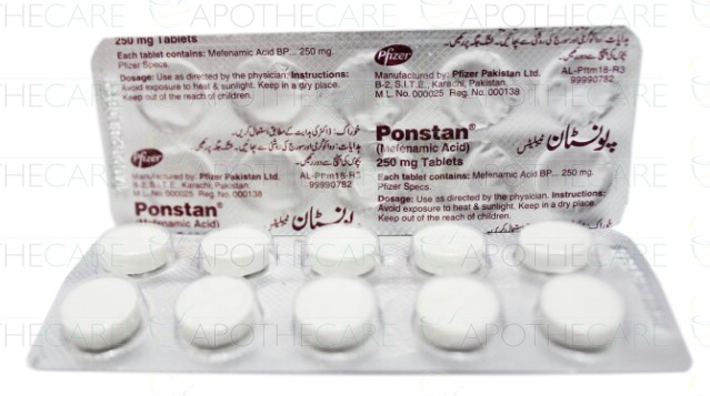 Product Name: Ponstan Tab 250mg 10'sProduct Form: TabletsPack Size: 10'sMarketed By: PFIZER PAKISTANGeneric Category: NSAIDIngredients: Mefenamic acid