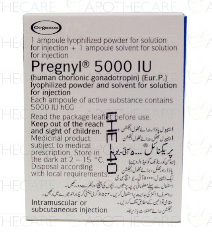 Product Name: Pregnyl Inj 5000IU 1Ampx1mlProduct Form: InjectionPack Size: 1Ampx1mlMarketed By: OBS PharmaGeneric Category: Hormonal ProductsIngredients: Human Chorionic Gonadotropin