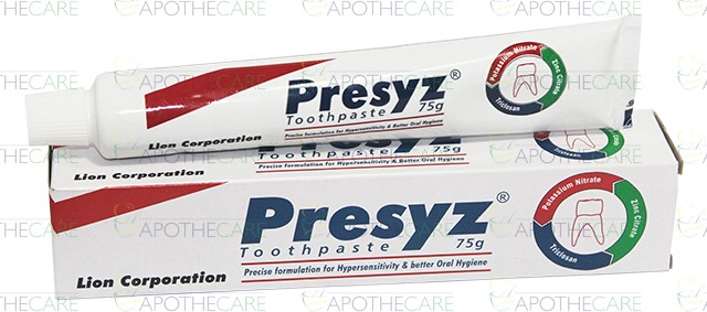 Product Name: Presyz Tooth paste 75gmProduct Form: Tooth pastePack Size: 75gmMarketed By: Platinum Pharmaceuticals (Pvt) LtdGeneric Category: Oral HygieneIngredients: Triclosan, Sodium Monofluorophosphate, Potassium Nitrate, Sodium Fluoride, Zinc Chloride, Zinc Citrate