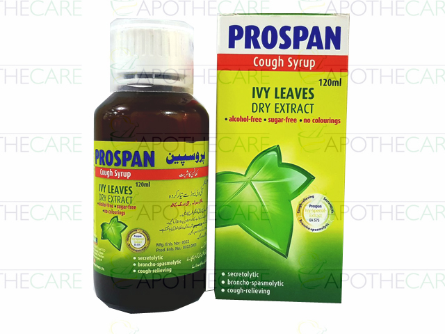 Product Name: Prospan Syp 120mlProduct Form: SyrupPack Size: 120mlMarketed By: Highnoon Laboratories Ltd.Generic Category: Herbal PreparationIngredients: Ivy Leaf Extract