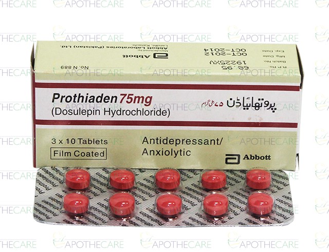 Product Name: PROTHIADEN Tab 75mg 3x10'sProduct Form: TabletsPack Size: 3x10'sMarketed By: ABBOTT LABORATORIES (PAKISTAN) LTD.Generic Category: ANTI-DEPRESSANT Ingredients: Dothiepin