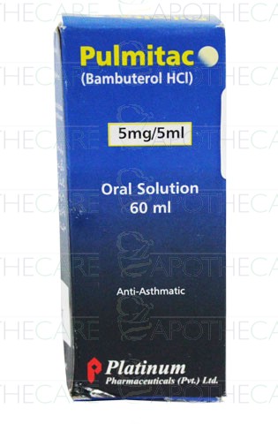 Product Name: Pulmitac Oral Sol 5mg/5ml 60mlProduct Form: SolutionPack Size: 60mlMarketed By: Platinum Pharmaceuticals (Pvt) LtdGeneric Category: B2 STIMULANTIngredients: Bambuterol