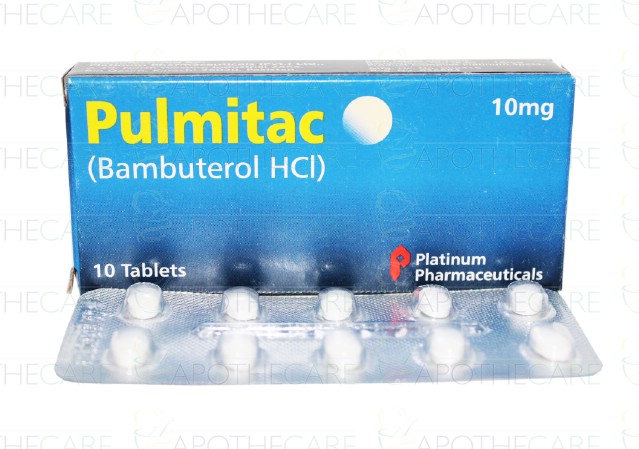 Product Name: Pulmitac Tab 10mg 10'sProduct Form: TabletsPack Size: 10'sMarketed By: Platinum Pharmaceuticals (Pvt) LtdGeneric Category: B2 STIMULANTIngredients: Bambuterol