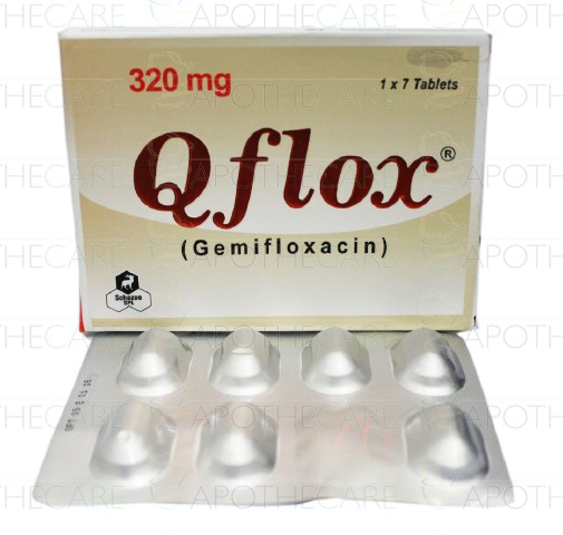 Product Name: Qflox Tab 320mg 1x7'sProduct Form: TabletsPack Size: 1x7'sMarketed By: Schazoo Pharmaceuticals (Pvt) LtdGeneric Category: Quinolones Anti-BacterialIngredients: Gemifloxacin